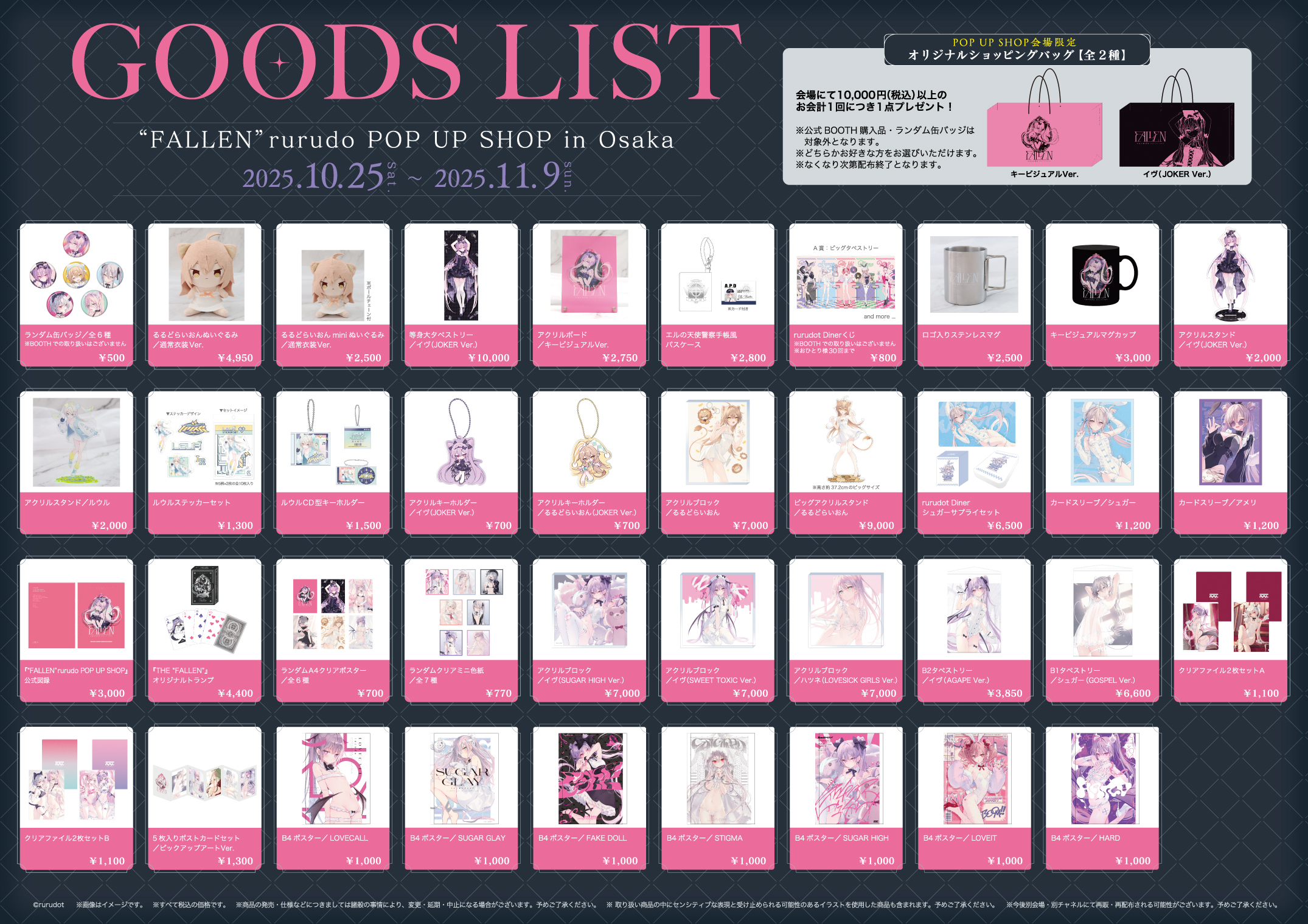 “FALLEN”rurudo POP UP SHOP in Osakaで販売されるグッズ情報の公開ならびに公式BOOTHの更新をお知らせいたします。大阪巡回で発売の新商品もございます。ぜひご注目ください。
